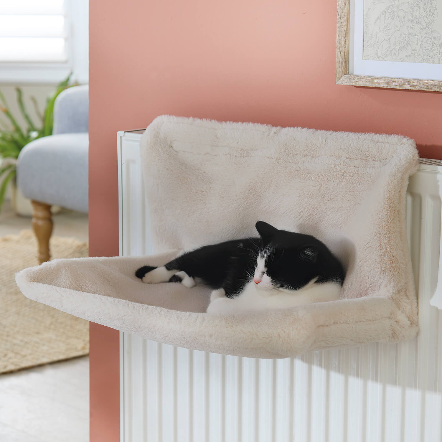 | Radiator Cat Bed H25 xW45 xD30cm, Suitable for Cats Up to 5kg, Faux Sheepskin Bed, Hooks Onto Most Radiators |